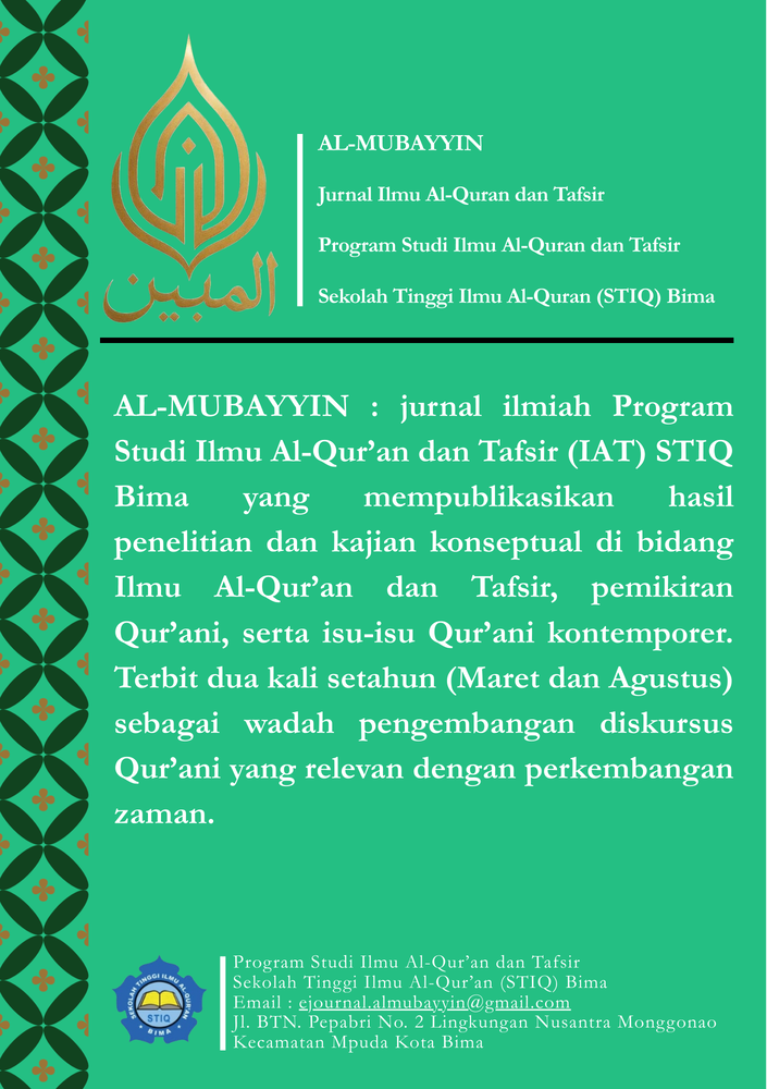 Al-Mubayyin adalah jurnal ilmiah yang diterbitkan oleh Program Studi Ilmu Al-Qur’an dan Tafsir (IAT), Sekolah Tinggi Ilmu Al-Qur’an (STIQ) Bima. Jurnal ini berfokus pada publikasi hasil penelitian dan kajian konseptual di bidang keislaman, khususnya Ilmu Al-Qur’an dan Tafsir, meliputi studi tafsir, ulumul Qur’an, pemikiran Qur’ani, serta isu-isu kontemporer yang berkaitan dengan nilai-nilai Al-Qur’an. Jurnal ini diterbitkan dua kali dalam setahun, yaitu pada bulan maret dan agustus.